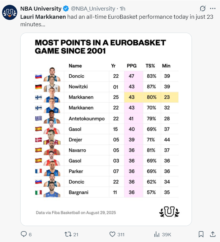 美媒NBA Mems:马尔卡宁在欧洲杯23分钟拿到43分,犹他爵士队这些年真是白白浪费了他的天赋。