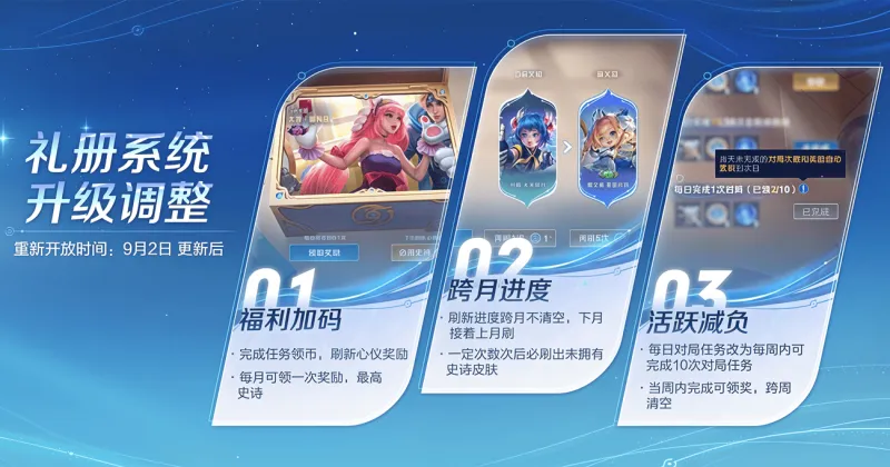 然后在对局外的调整有月度礼册和绑定点券,月度礼册的免费皮肤获取机制将调整为刷新机制,这样改动后就相当于从随机抽取变成了刷新的自选皮肤,并且刷新到120次数后,还必得史诗皮肤,比现在的礼册更有吸引力。