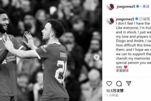 体育资讯7月4日讯 利物浦前锋若塔因车祸去世,年仅28岁。队友乔-戈麦斯通过社媒送上悼念: