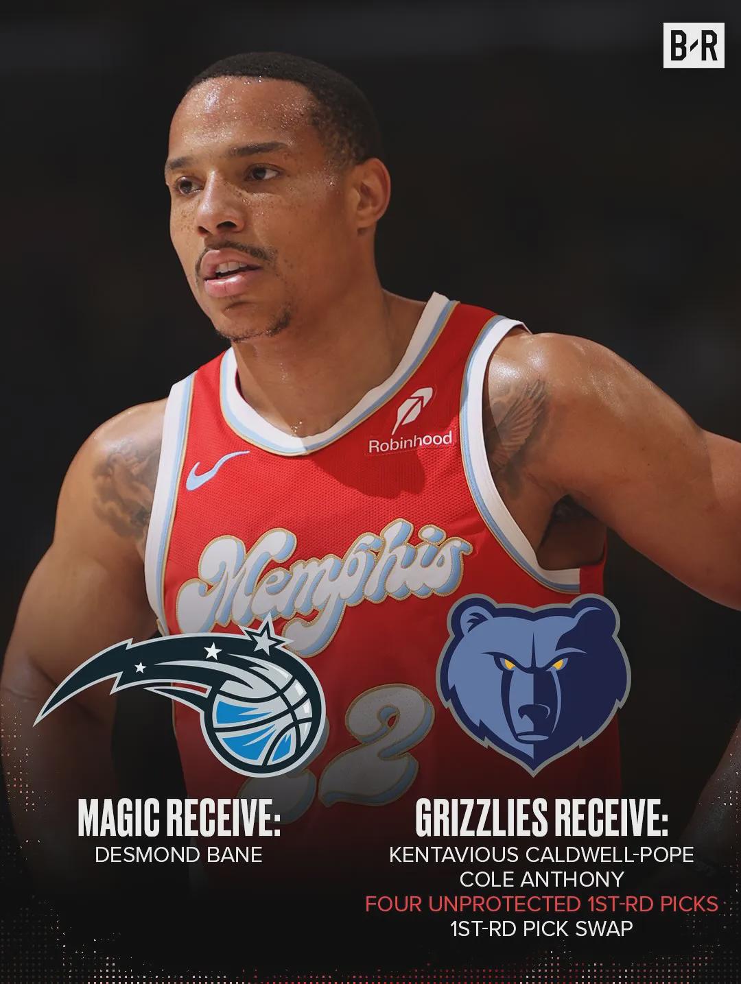 孟菲斯灰熊获得:波普、科尔安东尼、2025年第16顺位选秀权、2026年菲尼克斯太阳首轮选秀权、2028年奥兰多魔术首轮选秀权,2030年奥兰多魔术首轮选秀权、2029年奥兰多魔术首轮选秀权互换