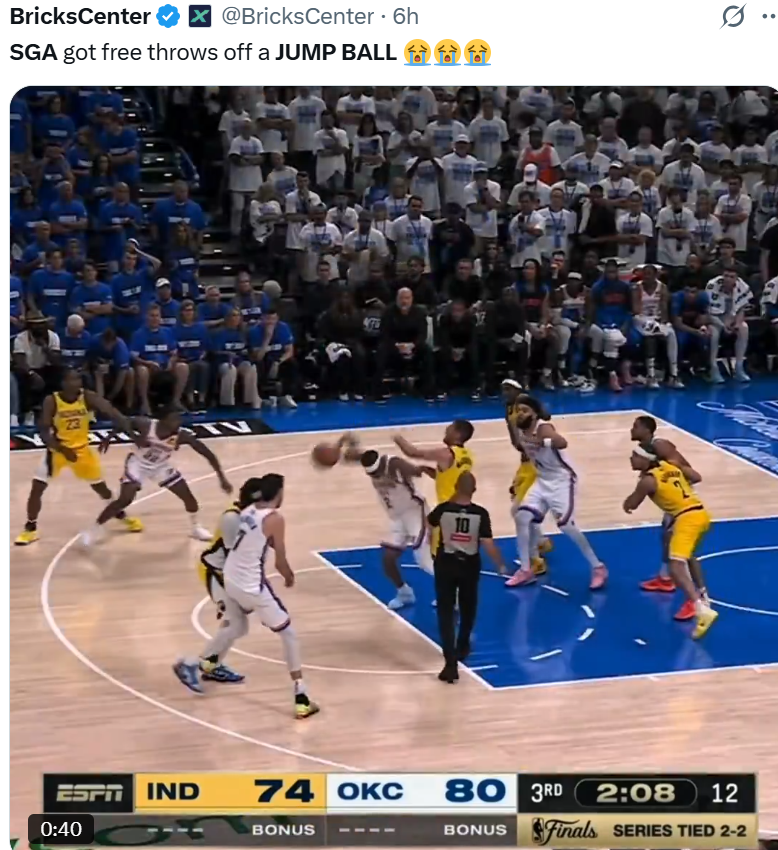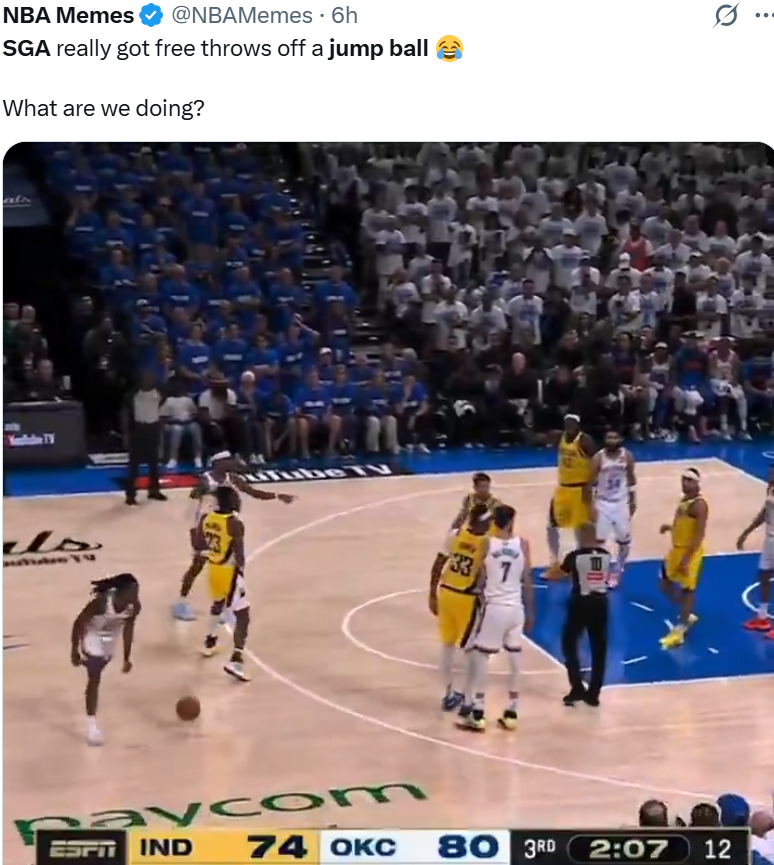 Fullcourtpass写道:“TJ·麦康奈尔在跳球时被SGA判罚了犯规。‘他(SGA)就是跳不高,这不是他的错。’”