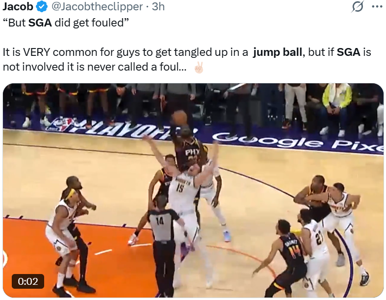 记者Jacob晒除了当时约基奇在争球时与对方纠缠在一起的画面,并且写道:“‘但是SGA却被犯规了’球员在跳球时缠在一起是非常常见的,但如果SGA没有参与其中,则永远不会被判罚”。