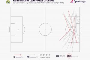针对库尔图瓦的言论,数据机构Opta发布了一则数据统计。皇马在对阵阿森纳的次回合比赛中共尝试了33脚运动战传中,这一数据创造了他们近五年正式比赛的最多纪录。