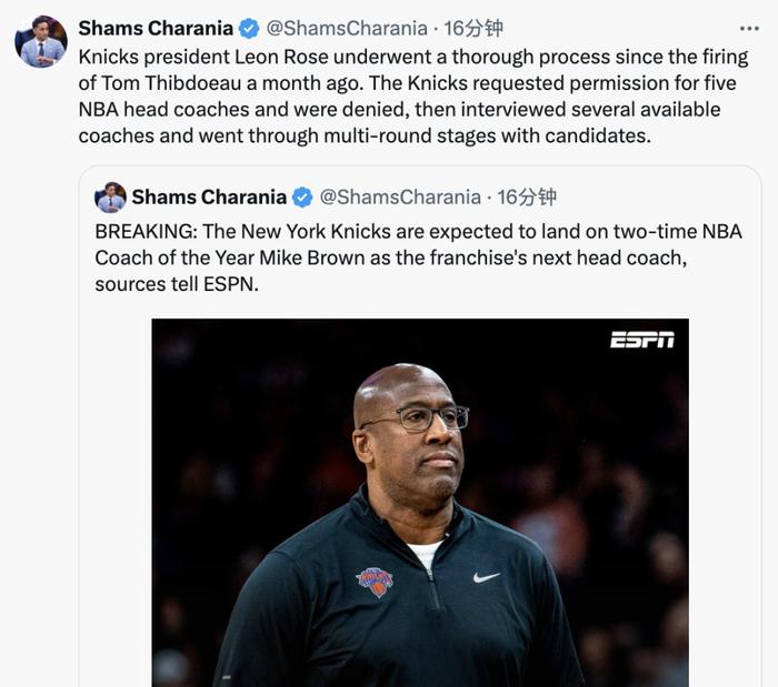 据消息人士透露,迈克-布朗是唯一一位多次面试尼克斯主教练候选人,其中包括当地时间周二与莱昂-罗斯、球队管理层和老板詹姆斯-多兰的会面。